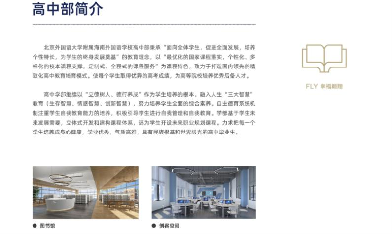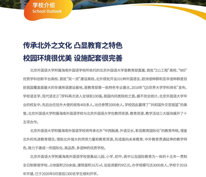 北京外国语大学附属海南外国语学校是由北京外国语大学、海南澄迈县政府与海南福隆文化教育投资有限公司合作举办的全日制寄宿学校。集幼儿园、小学、初中、高中以及国际教育为一体,十五年一贯制。学校占地面积250余亩,总投资约9亿元,建筑面积16万m²,开设教学班100个,办学规模可达3000余学生。学校于2018年开始建设,2020年9月正式开学。