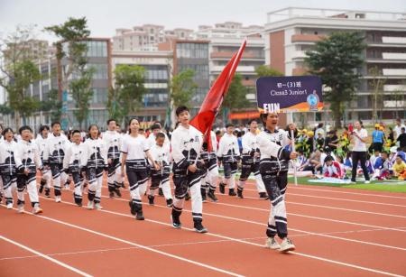 国旗方队、校旗方队、会徽方队、彩旗方队、鲜花方队、马术方队、裁判员方队、各学部方队、教师方队以昂扬的姿态进场,整齐划一,朝气蓬勃。铿锵的脚步,嘹亮的口号,处处彰显青春的活力。