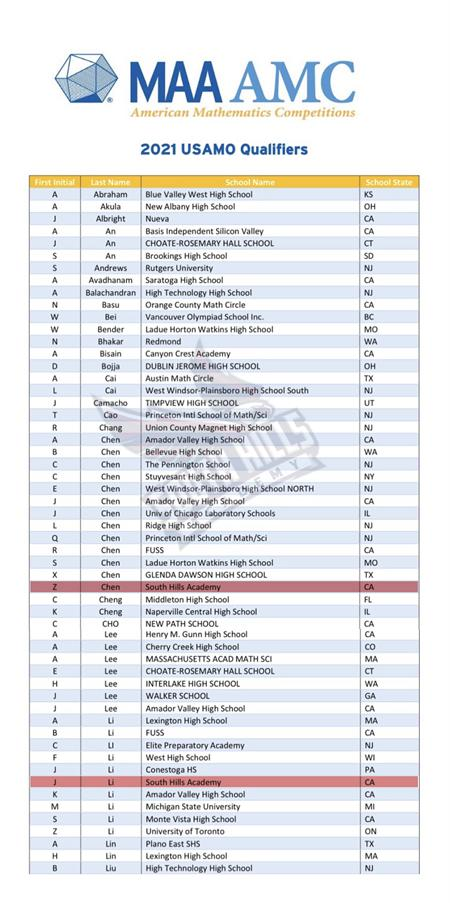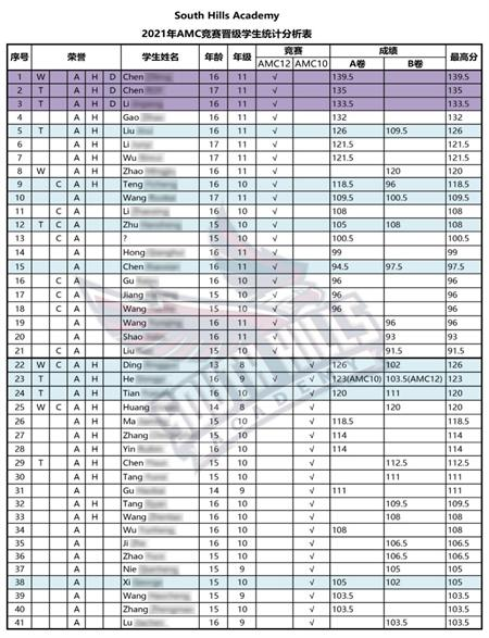 今年是美国加州南麓私立学校(SHA)第二年参加AMC竞赛,在专业教师团队和同学们的共同努力下,SHA在AMC12赛场上脱颖而出:41名同学成功晋级AIME!