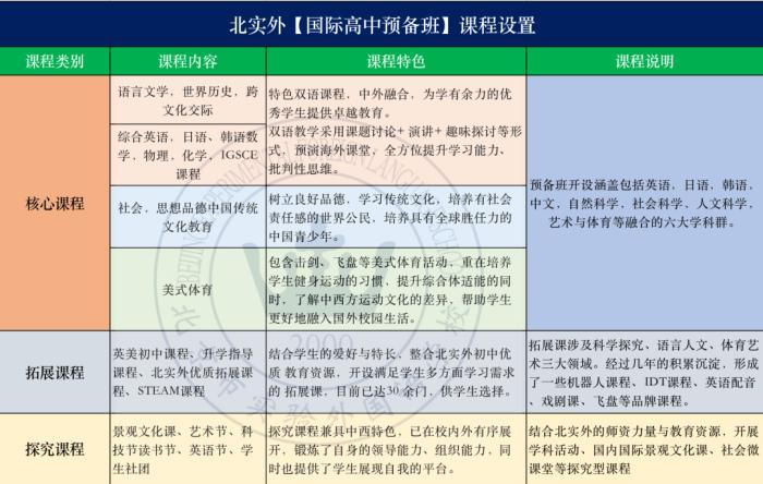 北实外国际高中预备班是由北实外A-Level项目、美高AP项目、日韩高中项目联手打造,专为8升9 年级学生、有意向升读国际高中的学生提供包括IGCSE课程、ELS课程、小语种语言强化课程、基础学科课程、课外活动等一系列课程与服务的一年制国际高中衔接课程班,学习结束后,学生可以升读北实外国际高中就读日韩英美方向10 年级。