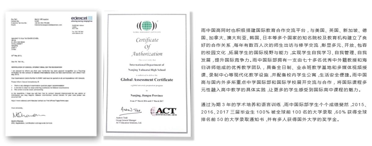 雨花台中学国际高中于2012年5月30日正式成立,同年被英国爱德思(EDEXCEL)国家考试局授权为GCE A levels及IAL国际高中课程的全球学术考试中心,中心代码为:93451,并成为英国爱德思国家考试局在江苏省内授权中学,负责GCE A levels及IAL国际高中课程的教学和考核,连续两年蝉联“年度爱德思市场影响力奖”; 2016年又被美国大学入学考试委员会(ACT)官方授权为美国高考课程的教学考试中心,成为南京市一所被其授权的公办高中教学考试中心,进一步推进了雨中和国际教育理念的接轨,为有志赴美、英、澳、加等发达国家深造的学子提供一条、可靠、快捷的留学通道。
