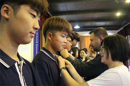揭牌仪式结束后,全体师生上台,每位教师做了简单的自我介绍,用较真诚的语言感染着在座的每一个人。随后,教师们亲手为每一位学生佩戴校徽。相信这群认真负责的教师和积极求索的学生们,会让长江学校国际部充满温暖和积极向上的力量。