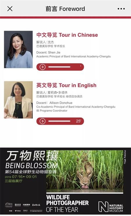 本次第54届全球野生动物摄影展的中英双语解说导览由巴德美际学术校长沈杰负责中文解说,英文解说由巴德美际学术校长及IB协调员Allison Donohue,巴德美际市场总监与学生支持服务主管、心理学老师Roberto Santos,双语中文老师孙晓满分别负责,老师们将语音解说与极富视觉影响力的摄影作品融为一体,为参观者带来一场“声临其境”视听体验。