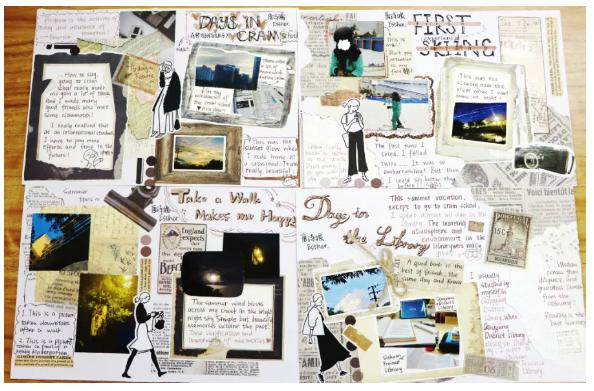 这是一份充满复古色彩的明信片手帐,通过邮票、照片贴纸、旧报纸,仿旧颜色等元素搭配将假期生活展现得淋漓尽致。