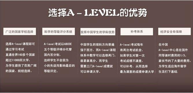 中国学生只需从基础数学、高等数学、物理、化学、经济学、商业学、会计学、心理学、法律等课程中选择3-4门课程学习,每年统一考试2-3次(可针对不理想单元多次考试),凭A-Level课程成绩可以直接入读英、美、澳、加、新加坡、新西兰、中国中国香港等地的大学本科,被誉为中国学生进入世界的较佳途径。