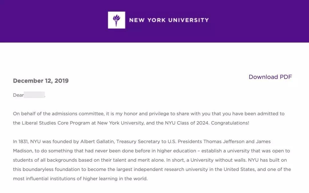 Antonio成功拿到纽约大学的offer,这也是博格思加州学校2020年ED早申第二枚offer,offer季的到来,相信博格思2020年的毕业生们将会陆续收到好消息。加油吧,孩子们!