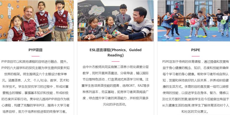 美华秉承融合中西方教育精髓的理念,以国际课程PYP项目为主体,依托多元课程体系和优秀师资力量,实施小班化教学,并支持两种以上语言帮助学生发展国际情怀。