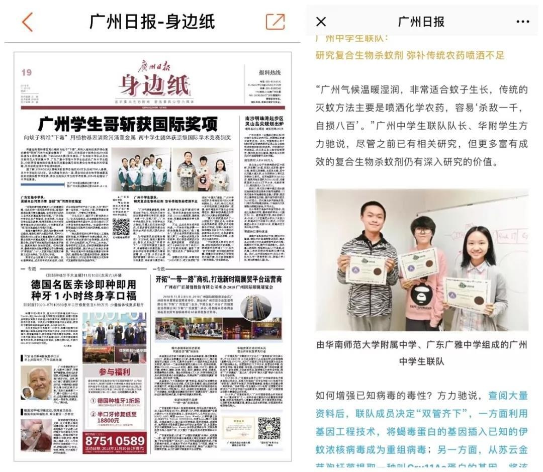 详见广州日报报道:《向蚊子精准“下毒”、用植物基因清除河涌重金属!广州学生哥斩获国际奖项 丨新闻早茶》