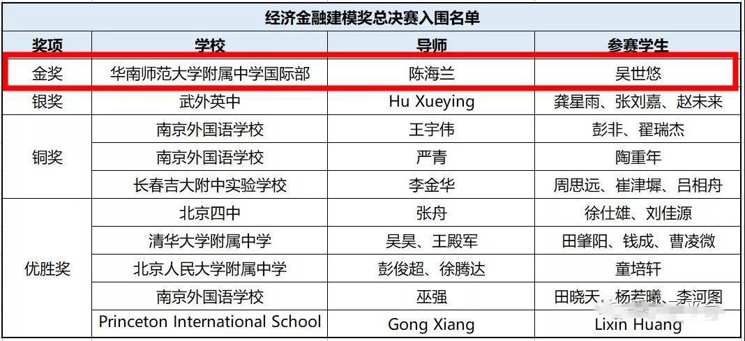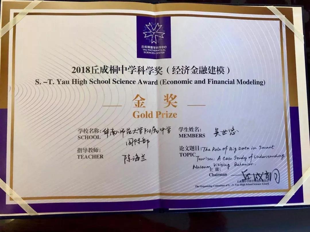 5位来自华附国际部的学子分别参加数学、化学和经济金融建模等三个领域的总决赛,经过激烈角逐,较终获得一金一银两铜的佳绩,吴世悠同学更成为丘成桐中学科学奖(经济金融建模)金奖“人”。