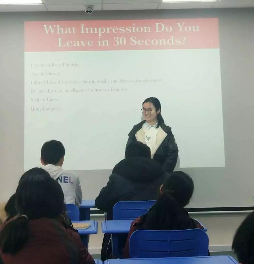 随后,Brett Gamboa教授继续分享了在一场演讲中如何在30秒之内给观众留下一个美好而又深刻的印象。教授先邀请了十年级Olivia同学上台进行自我介绍,之后就其演讲的内容、声音、肢体动作以及与听众的距离等方面进行了一番评价,既肯定了她的优点,同时也指出了需要改进之处,由此让学生能够更直观地掌握如何在短时间内得到听众肯定的技巧。