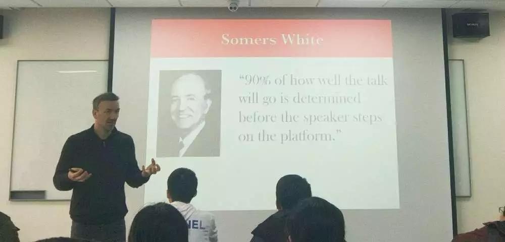 然后,Brett Gamboa教授引用了Somers White的名言,“90% of how well the talk will go is determined before the speaker steps on the platform. ”,让学生意识到一场演讲的成败很大程度上取决于演讲者上台之前的准备。他反复强调,一场成功的演讲离不开充分的准备。演讲者要提前明确演讲的目的、听众、主题、时长以及需要的辅助设备等,在此基础上再去准备演讲的内容和框架,再经过反复的修改和练习,相信较后一定会呈现一场掌声连连的精彩演讲。