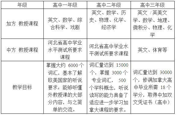 教学目标掌握大约 6000 个词汇,基本了解欧美国家的听说要求:能够听懂外教授课的大部分内容,与之简单的交流。词汇量达到 15000 个,掌握 3000 个专业词汇, 500 个学科概念,听说读写的能力具备了适应进一步学习加拿大课程的要求。词汇量达到 30000 个,修满加拿大高中毕业所需 18 个学分,取得中加双(高中)
