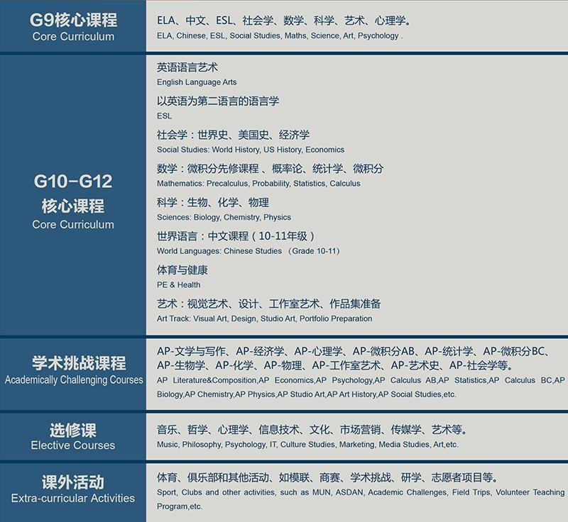 课程建立在美国国家核心课程标准(Common Core Standard)和美国大学理事会(College Board)高中毕业要求基础上,融入四门国家规定核心课程,另增加美国名校衔接课程与领导力课程,通过外教的全英文授课模式提供完整的美国高中学习体验。