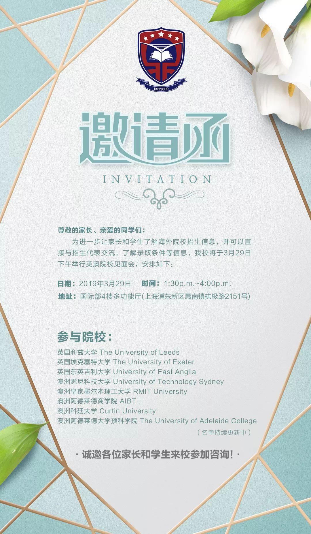 为了给学生和家长提供更便捷全面的名校申请信息,上师大附二外国际部升学指导中心特邀部分知名英澳院校的招生官、驻华招生代表来校,与学生、家长面对面沟通,零距离解答有关院校的录取条件等信息。欢迎各位学生、家长的到来,详情请见邀请函: